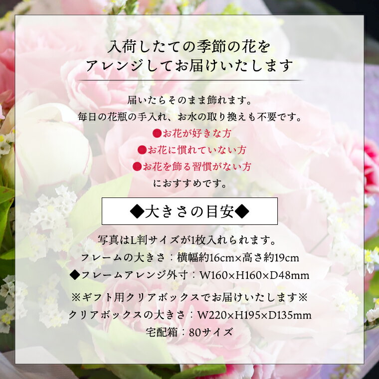 ◆プリザーブドフラワーのページです 届いたらそのまま飾れる嬉しいギフト 毎日の花瓶の手入れ、お水の取り換えも不要 ●お花が好きな方 ●お花に慣れていない方 ●お花を飾る習慣がない方 どなたでも気を遣わずに贈れるギフトです 入荷したての季節の花をアレンジしてお届けいたします 【用途】 ・卒業、入学祝い ・ご結婚祝い ・ご出産祝い ・結婚式でご両親への贈り物 ・母の日の贈り物 ・還暦のお祝い ・お悔やみの花 など、特にお祝いごとの贈り物として人気のフォトフレーム プリザーブドフラワーは高級志向な方にも人気です ◆人気のフォトフレーム ◆ブライダルギフトとしても人気 ◆いつも優しいあの人に ◆女性らしいあの人に ◆お子さんやお孫さんの誕生のお祝いに ◆ペット好きな方にも ラッピングの代わりに専用のギフト用クリアボックスに入れてお届けいたします 横が開閉するので横にスライドさせるようにボックスから出していただくとお写真のセットもスムーズです (おリボンも邪魔にならないようにお付けします) ほこりや、お花の傷みを気にせずに飾っていただけます 【商品サイズ】 写真はL判サイズが1枚入れられます フレームの大きさ:横幅約16cmx高さ約19cm ギフト用クリアボックス:横幅22cn×高さ19.5cm×奥行13.5cm 大きさの目安 ◆フレームアレンジ外寸:W160×H160×D48mm ギフト用クリアボックスでお届けいたします ※クリアボックスの大きさ W220×H195×D135mm 宅配箱 80サイズ ■お受け取り後は、すぐに状態をご確認ください。