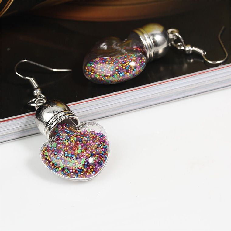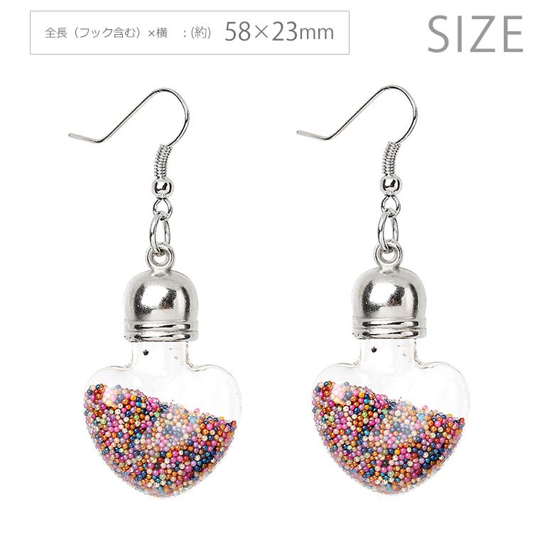 1ペア 2個入 ピアス ハート型 ガラス瓶チャーム 穴無しシードビーズ入り ミックスカラー / ミニチュア トランプモチーフ カラフル 飾り 装飾 ぶら下がり シルバーカラー 銀色金具 フック式 U字【ゆうパケット対応】