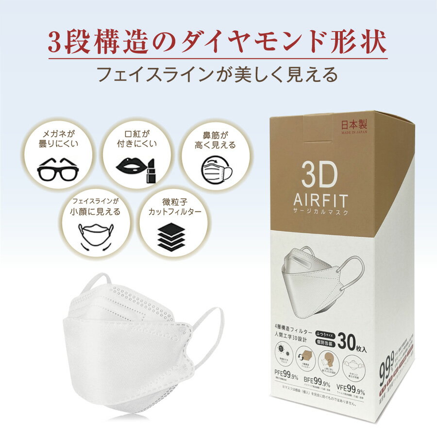 立体マスク 3D AirFit マスク 日本製 A-JN95 ホワイト 30枚 マスク 不織布 立体 不織布マスク 個包装 使い捨てマスク 血色 口紅がつきにくい おしゃれ 大人 4層マスク 不織布 カラーマスク 立体型 ダイヤモンドマスク 国産 くちばし型 柳葉型
